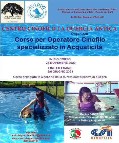 Piscina coperta con acqua e locale riscaldato ed appositamente attrezzato, anche per l’asciugatura del vostro cane a fine lezione, di dimensioni 8mt x 4mt. Per il massimo comfort abbiamo dotato la nostra piscina di un impianto di filtrazione maggiorato rispetto agli standard previsti e trattiamo l’acqua con un innovativo sistema per la disinfezione, ammesso dalla vigente normativa in materia, che oltre ad assicurare sempre un acqua trasparente e disinfettata risulta essere ideale per il bagno dei nostri amici a quattro zampe in quanto non è aggressivo per la cute ed il mantello, così da non necessitare di un apposito risciacquo a fine nuotata come invece normalmente è d’obbligo con le disinfezioni a base di cloro. Tale trattamento non rilascia inoltre composti odorosi ed irritanti e non genera infiammazioni intestinali in caso di ingerimento da parte nostra o dei nostri cani. Le attività che svolgiamo sono: attività ludico/educative – avvicinamento all’acqua – rinforzo fiducia e relazione – attività di svago – attività di nuoto libero per cani in sovrappeso – attività di nuoto libero per cani anziani – attività di nuoto libero per mantenimento e/o potenziamento del tono muscolare per cani da esposizione o sportivi. Attiva per tutto l’anno si richiede per l’ingresso in acqua obbligatoriamente l’utilizzo di idonei calzari da piscina e di una muta o mezza muta (così come da vigente normativa in materia di igiene e sanità pubblica)
