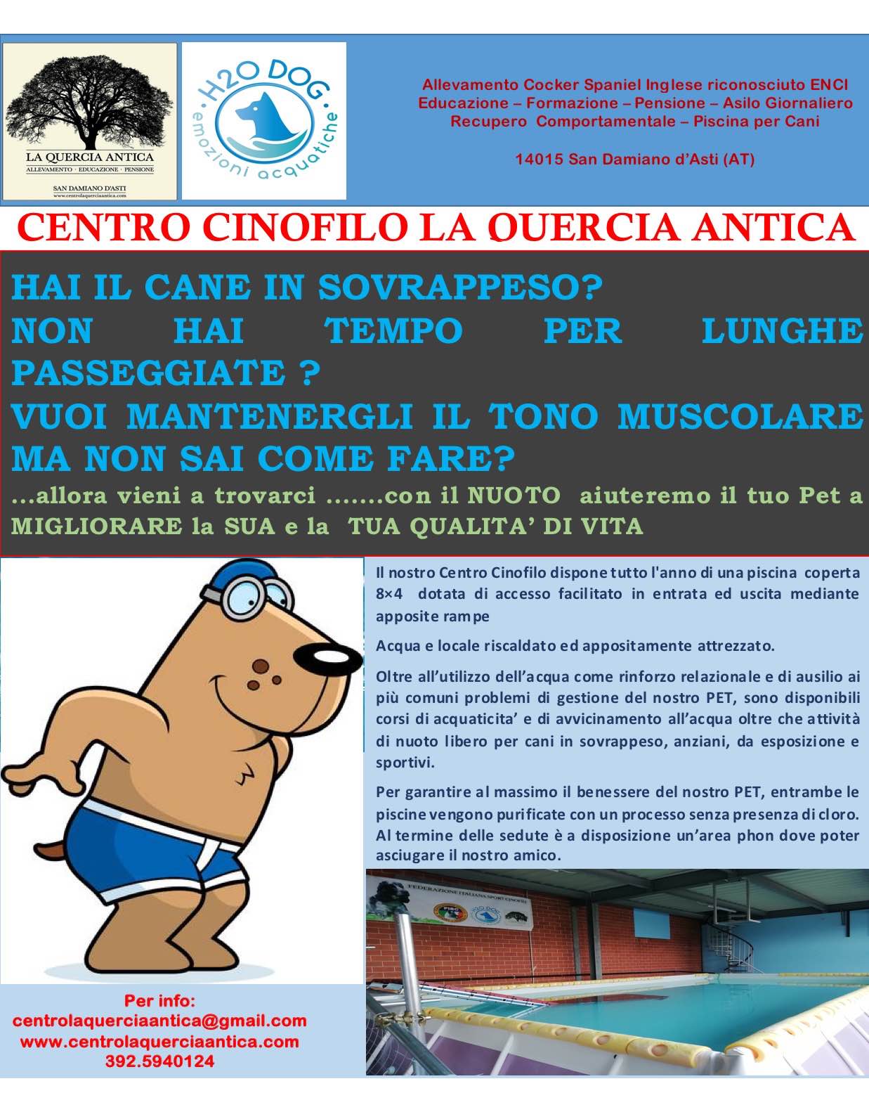 Piscina estiva per cani 8mt x 4mt in area recintata con spazio verde attrezzato di punto acqua, doccia, spogliatoio, sdraio ed ombrellone. Per il massimo comfort abbiamo dotato la nostra piscina di un impianto di filtrazione maggiorato rispetto agli standard previsti e trattiamo l’acqua con un innovativo sistema per la disinfezione, ammesso dalla vigente normativa in materia, che oltre ad assicurare sempre un acqua trasparente e disinfettata risulta essere ideale per il bagno dei nostri amici a quattro zampe in quanto non è aggressivo per la cute ed il mantello, così da non necessitare di un apposito risciacquo a fine nuotata come invece normalmente è d’obbligo con le disinfezioni a base di cloro. Tale trattamento non rilascia inoltre composti odorosi ed irritanti e non genera infiammazioni intestinali in caso di ingerimento da parte nostra o dei nostri cani. Le attività che svolgiamo sono: attività ludico/educative – avvicinamento all’acqua – rinforzo fiducia e relazione – attività di svago. Attiva per tutto il periodo estivo si richiede per l’ingresso in acqua obbligatoriamente l’utilizzo di idonei calzari da piscina e di una muta o mezza muta (così come da vigente normativa in materia di igiene e sanità pubblica)